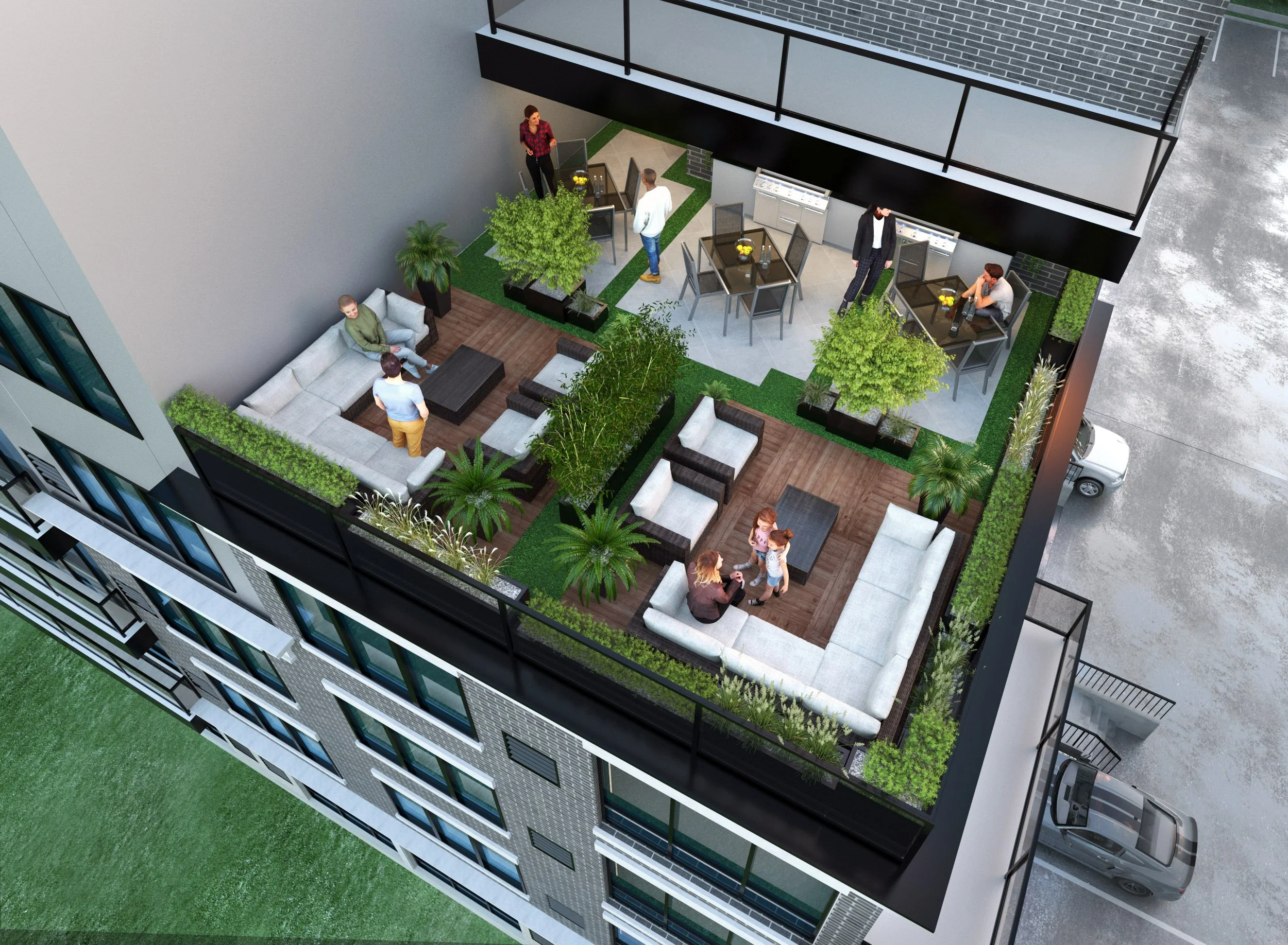 Roof top terrace equipped with multiple lounge areas, firepits and BBQs and lounging and relaxing furniture